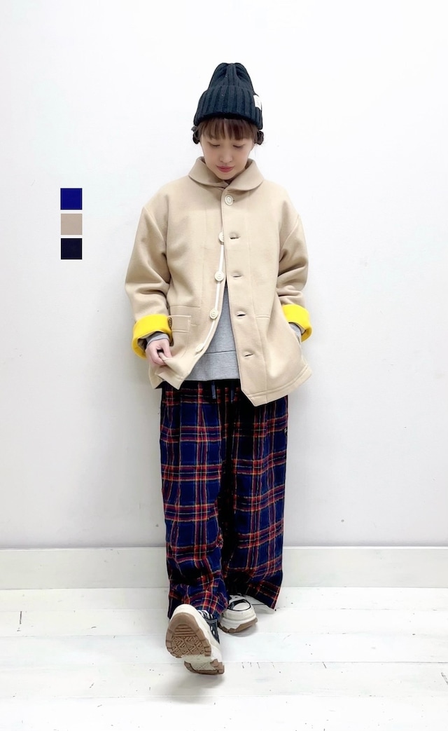 【快晴堂】 ダッフルコート一枚仕立て 53JK-41 ¥38,000+税 color.1 ラピスラズリブルー color.2 ミルクティーベージュ color.5 ロイヤルネイビー size 3+ 着丈90cm 身幅55cm 袖丈55cm 肩幅46cm アームホール26cm ※モデル身長153cm着用 size 5+ 着丈92,5cm 身幅55cm 袖丈60cm 肩幅48cm アームホール28cm WOOL (メリノウール)81% NYLON19% ダッフルコート一枚仕立てのご紹介です。 快晴堂の冬の定番生地カットメルトン。 一般的なメルトンは重量感のある生地 ですが、快晴堂のカットメルトンは、 カットソーを織る機械で作るので非常 に軽くて柔らかくなめらかです。 断ち切りOKなので極力縫しろをつけずに、 軽さのある仕立てに。3型とも内側に プリントを施しています。快晴堂ならでは の見ているだけでも楽しくなる、 かわいらしさ満載のプリントです。 *ウールの生地は、製造の際に出る遊び毛 という細い繊維が取りきれず、着用始めの 頃は出る量が多い場合があります。 ラピスラズリブルーはそのキレイな色 のため特に抜け毛が目立つかもしれません。 ウールの製品である以上、全く出なくなる わけではありませんが、しばらく着ている うちに徐々に少なくなり気にならなくなります。 □当店では店舗で在庫を 共有しており在庫連動システムの 更新のタイミングにより 欠品になる場合がございます。 万が一品切れの場合は何卒 ご容赦頂けます様 よろしくお願い致します。 □画像のお色はブラウザや 設定などにより、 実物の色と若干、 異なる場合がございます。 □採寸の誤差はお許し下さい。 □店舗併用の為、値札シールの はがし跡がありますがご了承ください。