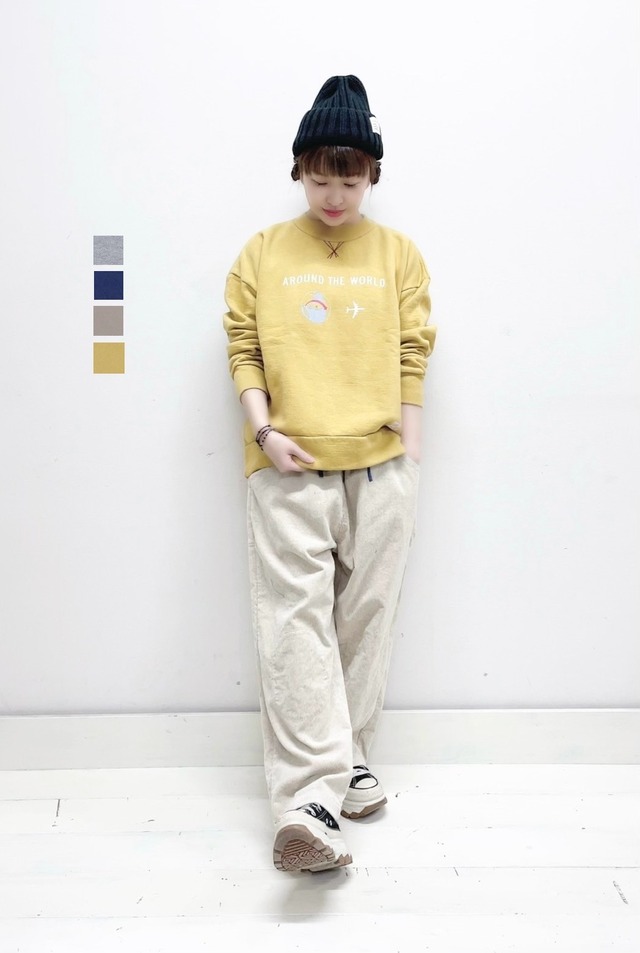 【快晴堂】 裏起毛ロゴGirl'sトレーナー come fly with me 53C-119 ¥15,000+税 color.2 TOPグレー color.6 ネイビー color.8 カーキベージュ color.11 アンティークイエロー size 3+ 着丈63cm 身幅65cm 裾巾59cm 肩幅60cm 袖丈44cm 裾幅21cm ※モデル身長153cm着用 COTTON100% 裏起毛ロゴGirl'sトレーナー come fly with me のご紹介です。いつも作っているトレーナー は3本針ミシン、ラグラン袖、脇や袖口、裾が フライス使いのトラディショナルなアメリカ スタイルです。ビンテージライクな良さが あります。それに対してこちらはオーバー ロック縫製で、フライスをあまり使わず、 やわらかさを出しました。girlyな優しい 感じです。バストと裾の幅に差をつけて あり、ワイド幅でもすっきり見えます。 ラグラン袖で肩幅や肩の厚みを気にされる 方には、こちらの方がすっきりして見えます。 □当店では店舗で在庫を 共有しており在庫連動システムの 更新のタイミングにより 欠品になる場合がございます。 万が一品切れの場合は何卒 ご容赦頂けます様 よろしくお願い致します。 □画像のお色はブラウザや 設定などにより、 実物の色と若干、 異なる場合がございます。 □採寸の誤差はお許し下さい。 □店舗併用の為、値札シールの はがし跡がありますがご了承ください。