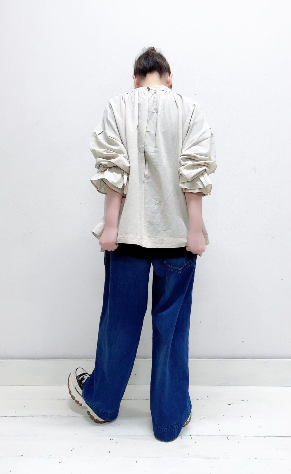 衿ぐりや袖口にたっぷりとギャザーを入れ、
