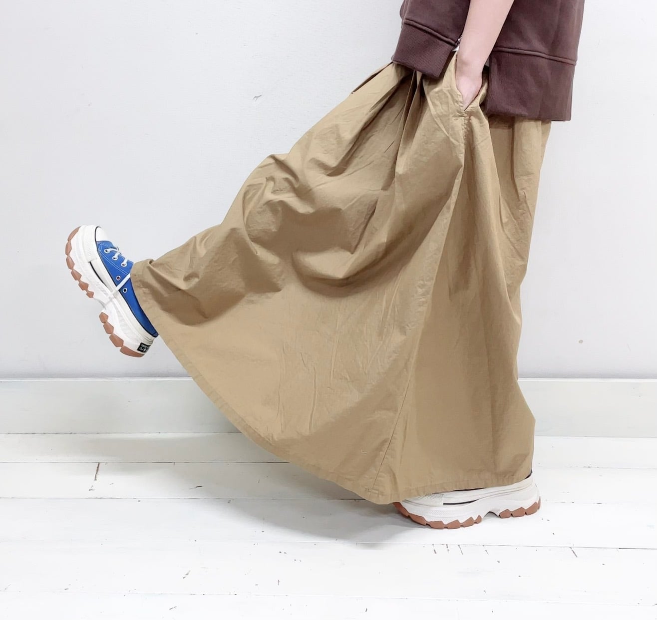 フレアシルエットが魅力で、歩くたびに