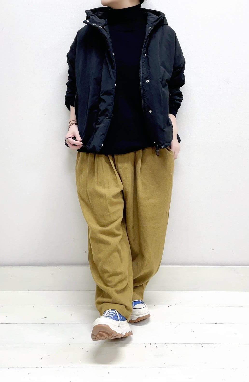ショート丈はパンツやスカートと合わせやすく、