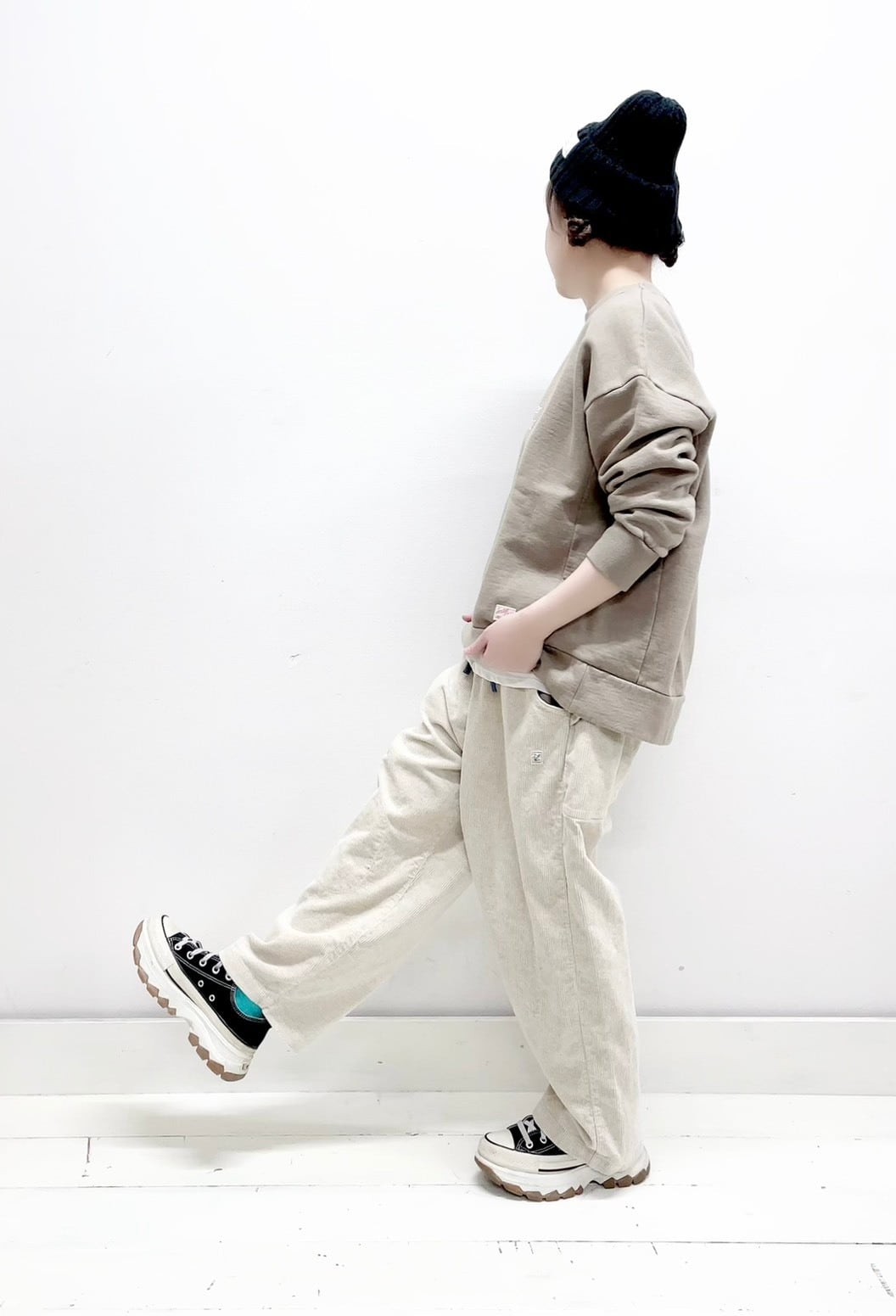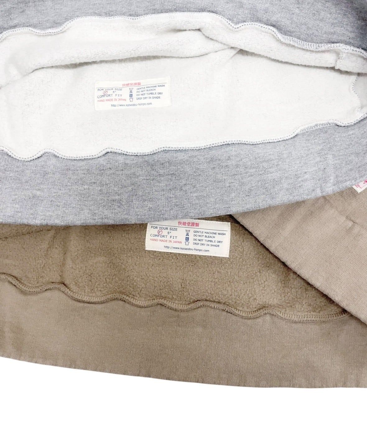 は3本針ミシン、ラグラン袖、脇や袖口、裾が
