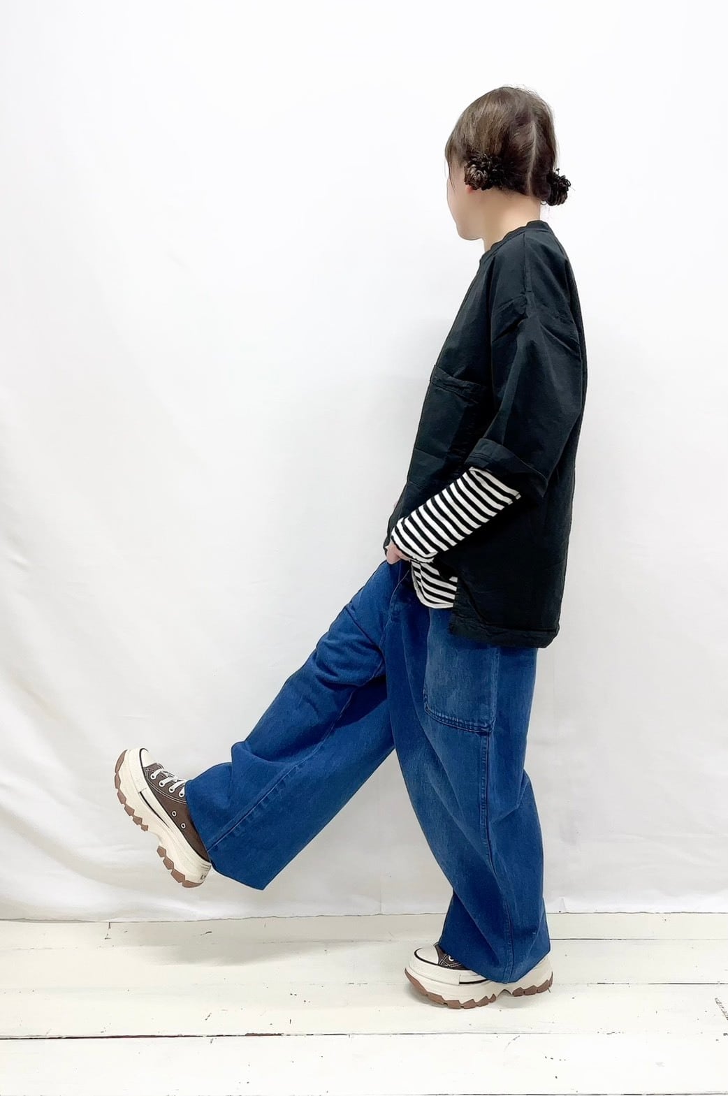 さらりとした綿素材が心地よく、肌に優しい着心地を実現しています。裾にはヒモが施され、自由にシルエットを調整することができるため、さまざまなスタイルを楽しめます。ゆったりとしたワイドシルエットは特にリラックス感があり、カジュアルなコーディネートにぴったりです。