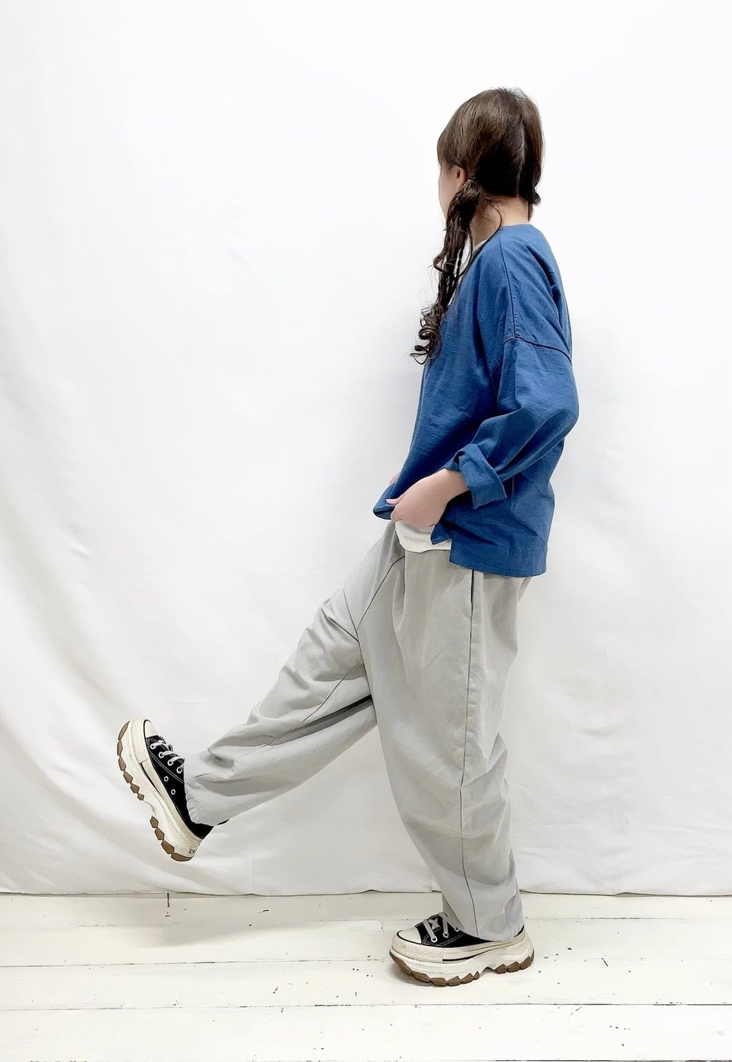 さらりとした綿素材が心地よく、肌に優しい着心地を実現しています。裾にはヒモが施され、自由にシルエットを調整することができるため、さまざまなスタイルを楽しめます。ゆったりとしたワイドシルエットは特にリラックス感があり、カジュアルなコーディネートにぴったりです。