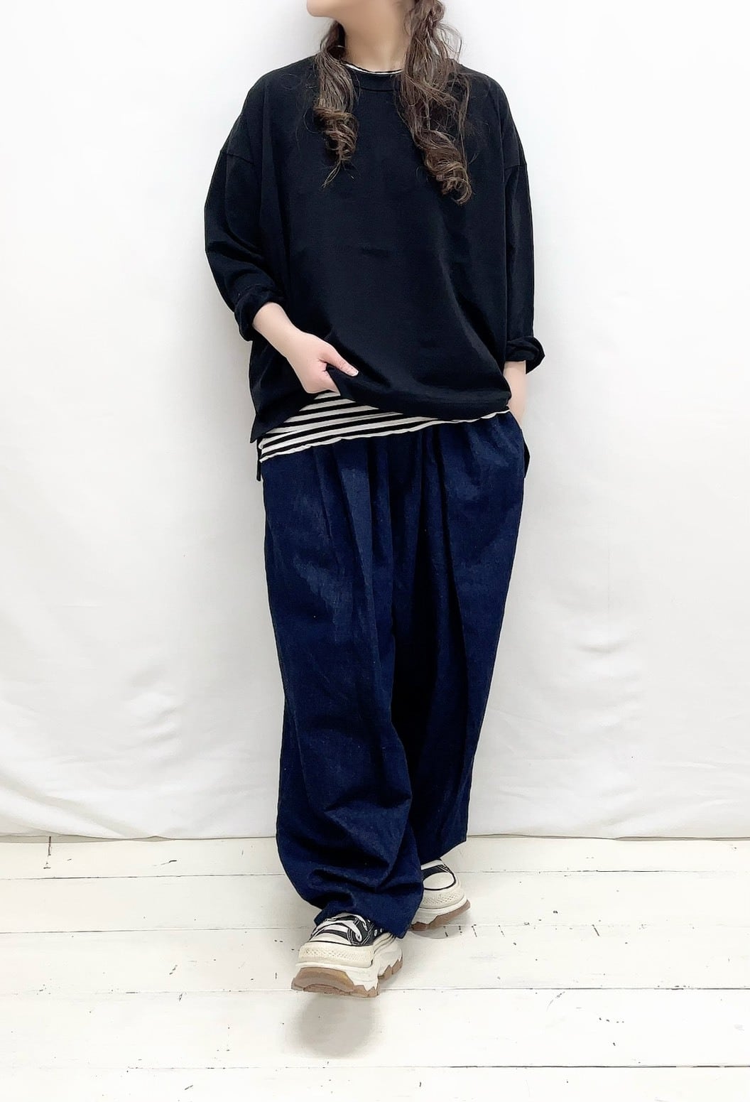 さらりとした綿素材が心地よく、肌に優しい着心地を実現しています。裾にはヒモが施され、自由にシルエットを調整することができるため、さまざまなスタイルを楽しめます。ゆったりとしたワイドシルエットは特にリラックス感があり、カジュアルなコーディネートにぴったりです。