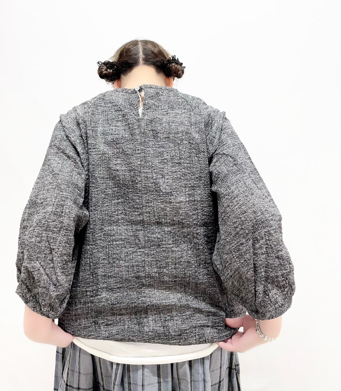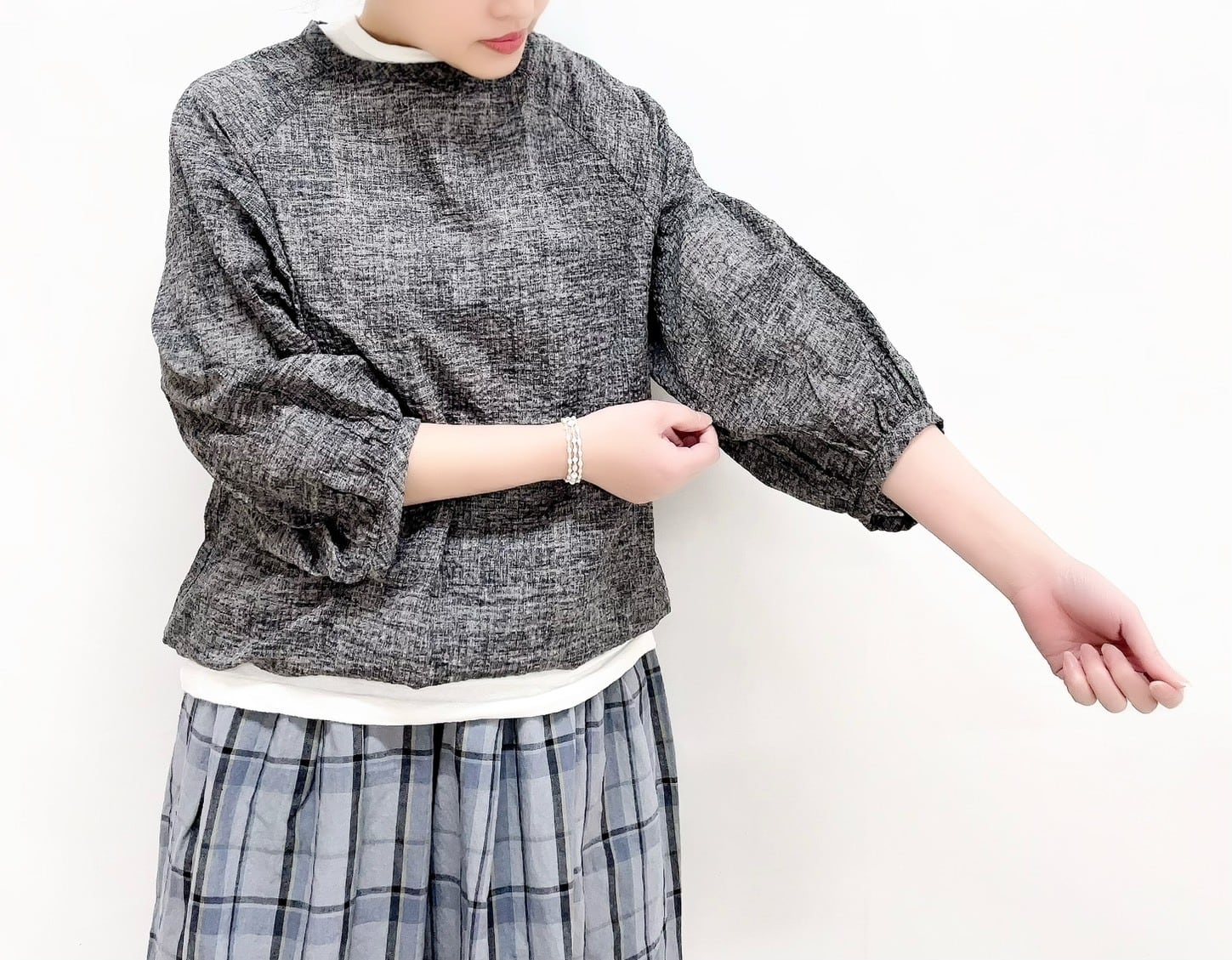 ギャザーが施された7分袖は、動きやすさを