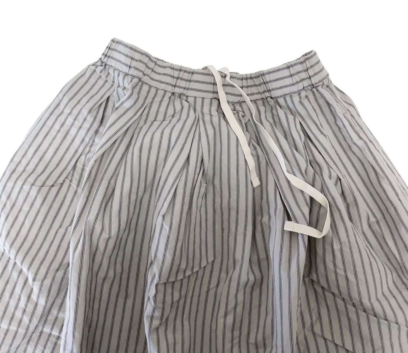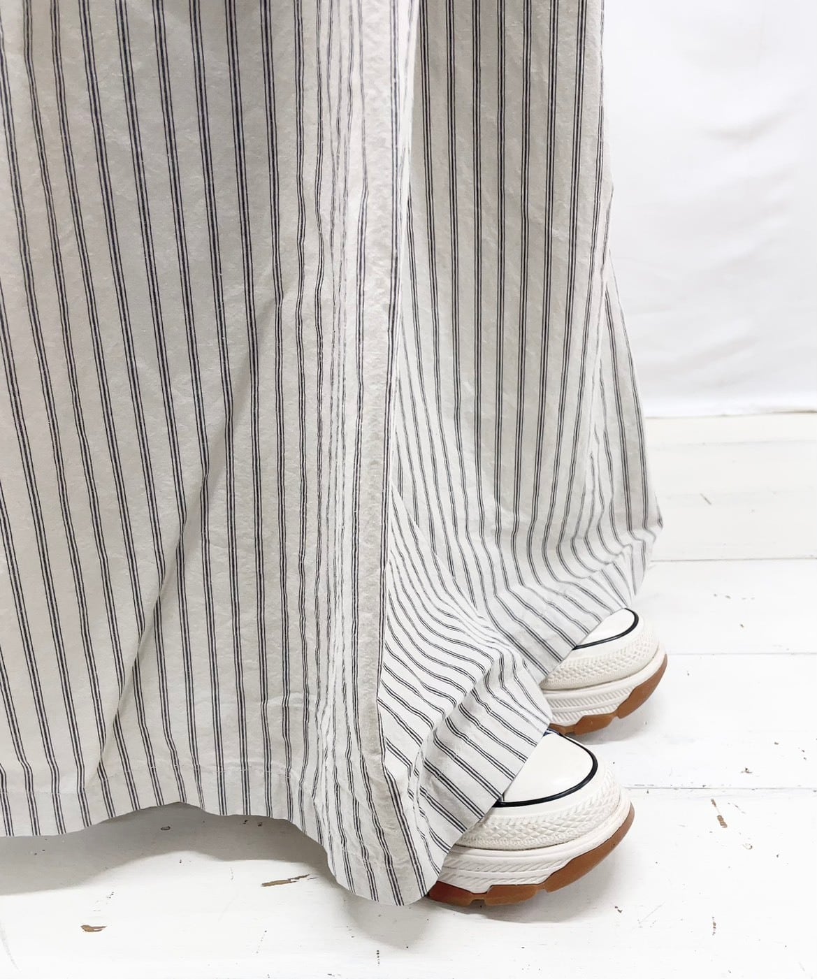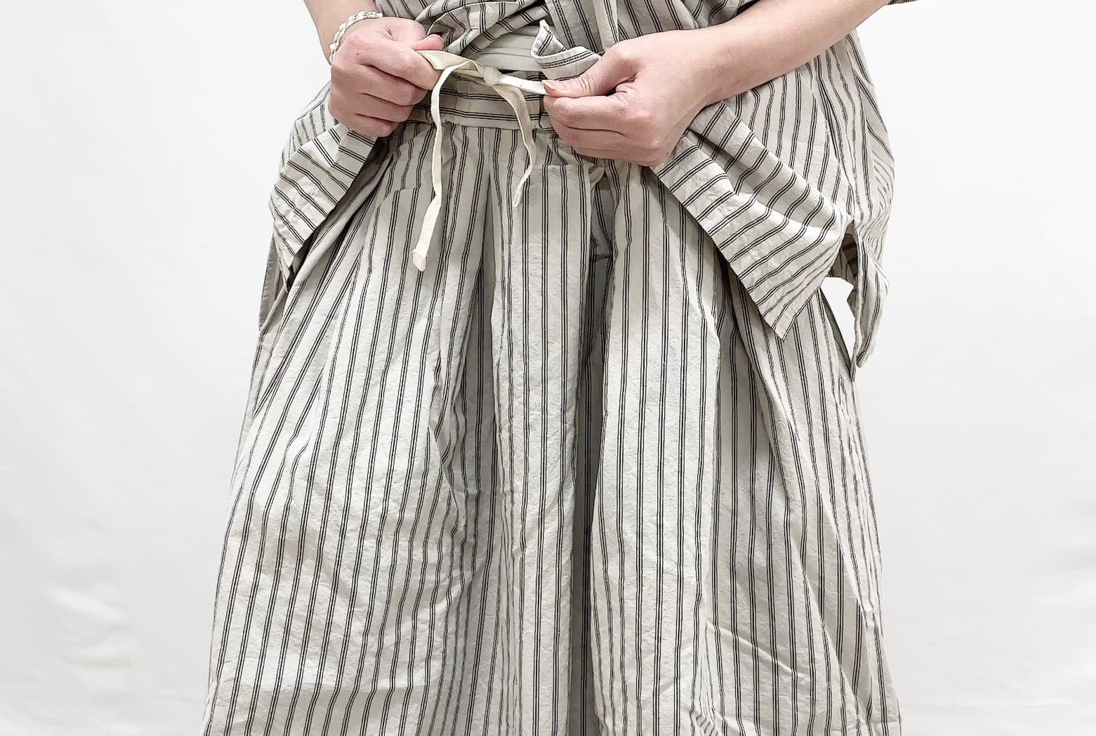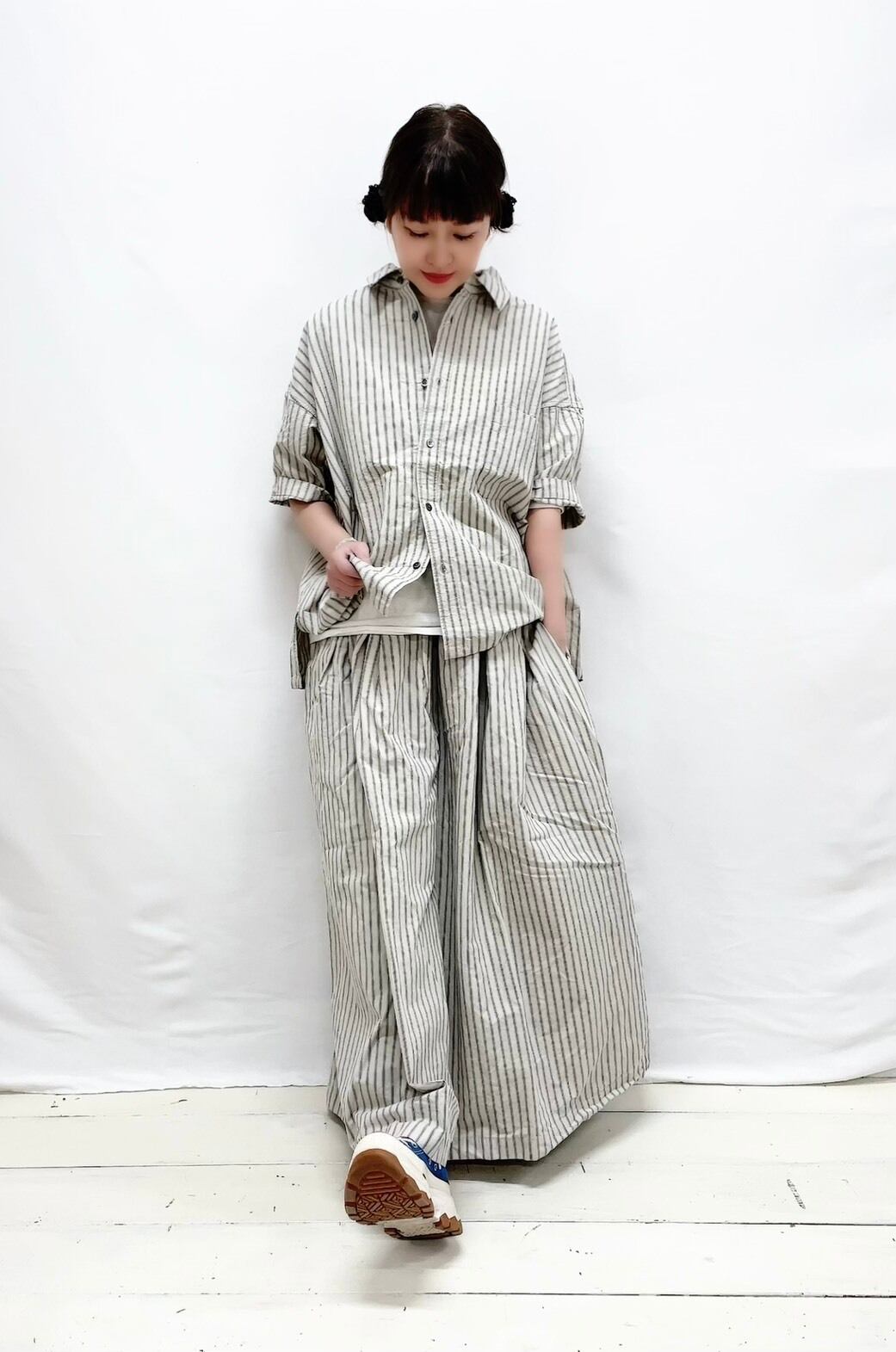 さらりとした綿素材が心地よく、肌に優しい着心地を実現しています。裾にはヒモが施され、自由にシルエットを調整することができるため、さまざまなスタイルを楽しめます。ゆったりとしたワイドシルエットは特にリラックス感があり、カジュアルなコーディネートにぴったりです。