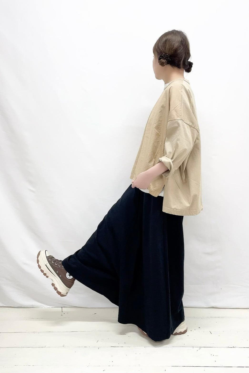 さらりとした綿素材が心地よく、肌に優しい着心地を実現しています。裾にはヒモが施され、自由にシルエットを調整することができるため、さまざまなスタイルを楽しめます。ゆったりとしたワイドシルエットは特にリラックス感があり、カジュアルなコーディネートにぴったりです。