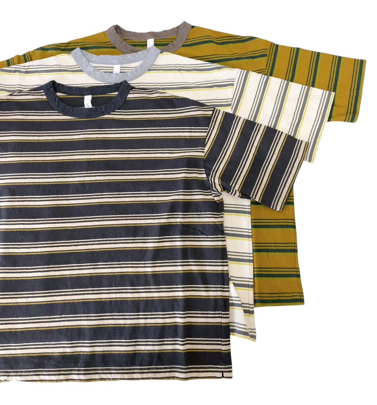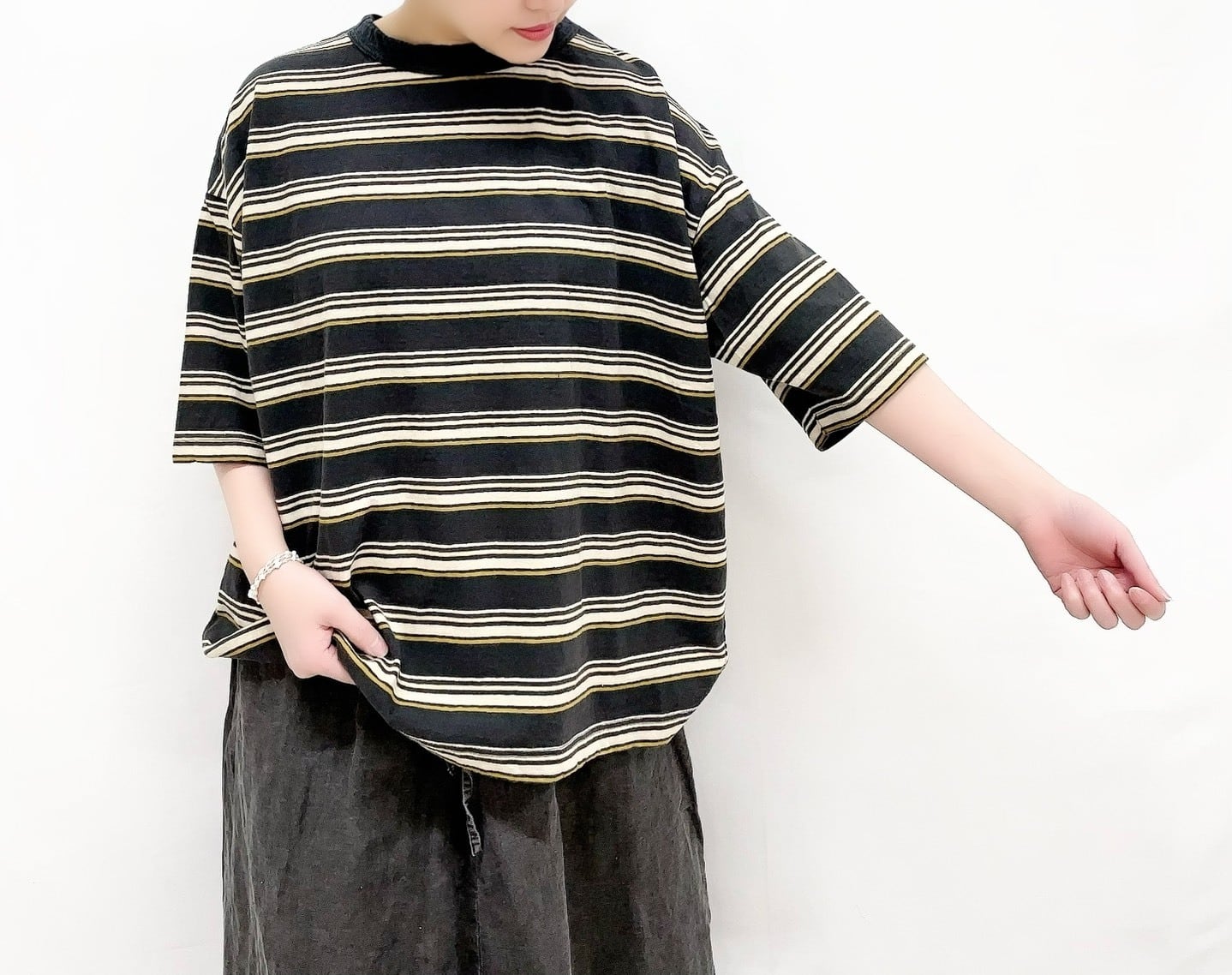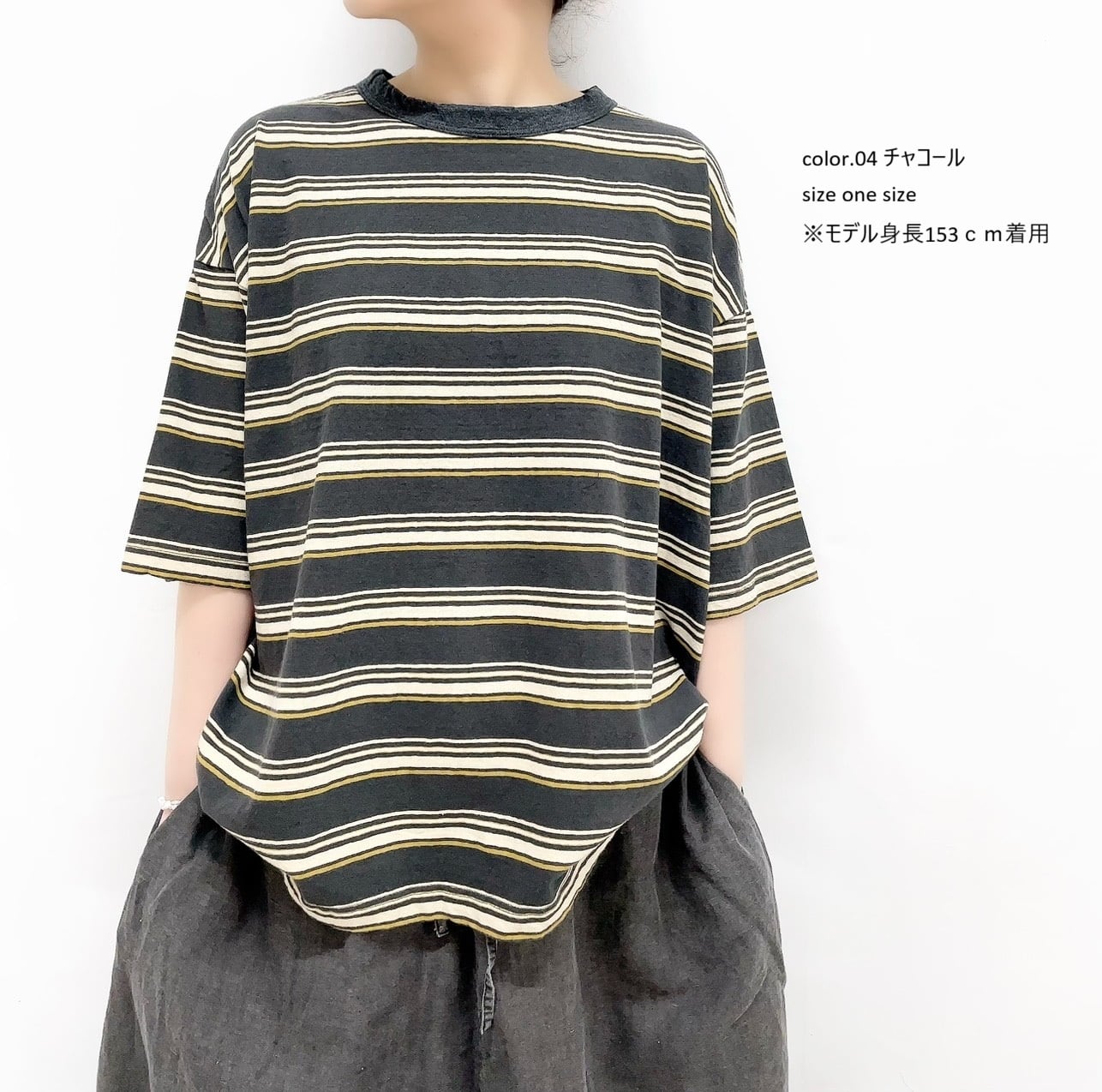 10/1リサイクルムラ糸ボーダー5分袖ワイドTシャツ