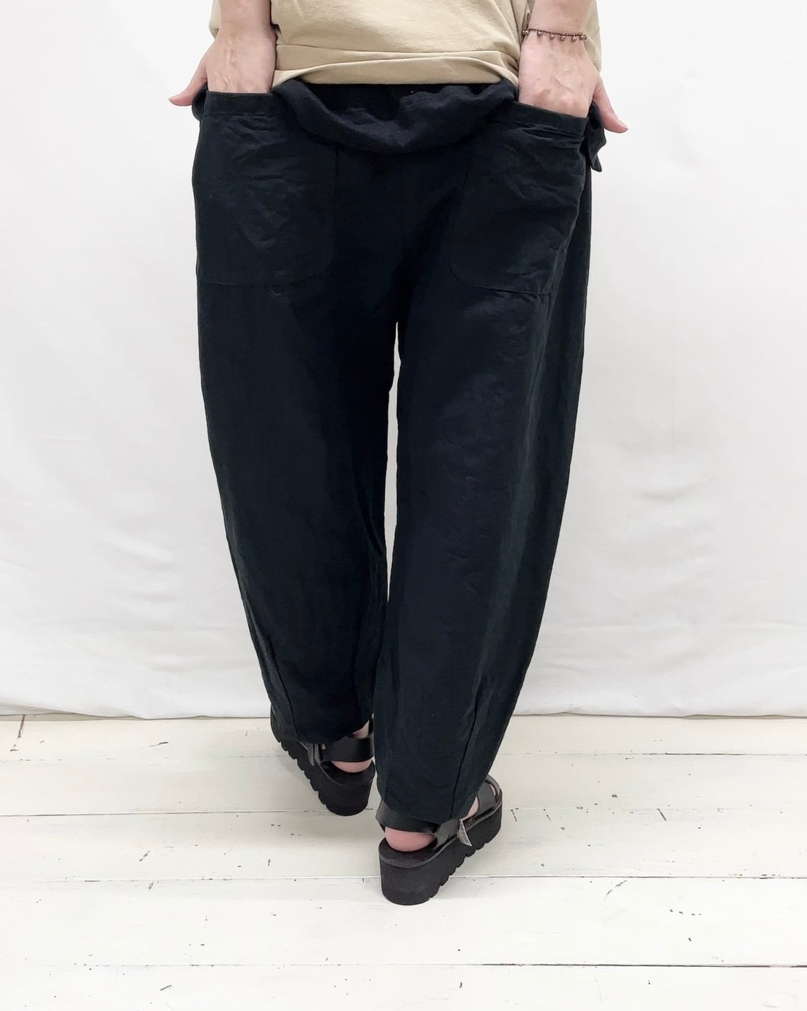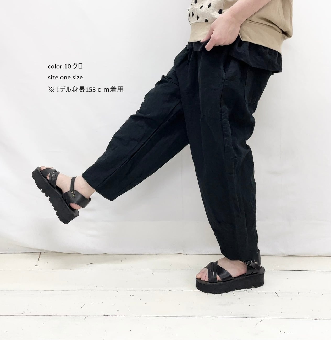 さらりとした綿素材が心地よく、肌に優しい着心地を実現しています。裾にはヒモが施され、自由にシルエットを調整することができるため、さまざまなスタイルを楽しめます。ゆったりとしたワイドシルエットは特にリラックス感があり、カジュアルなコーディネートにぴったりです。