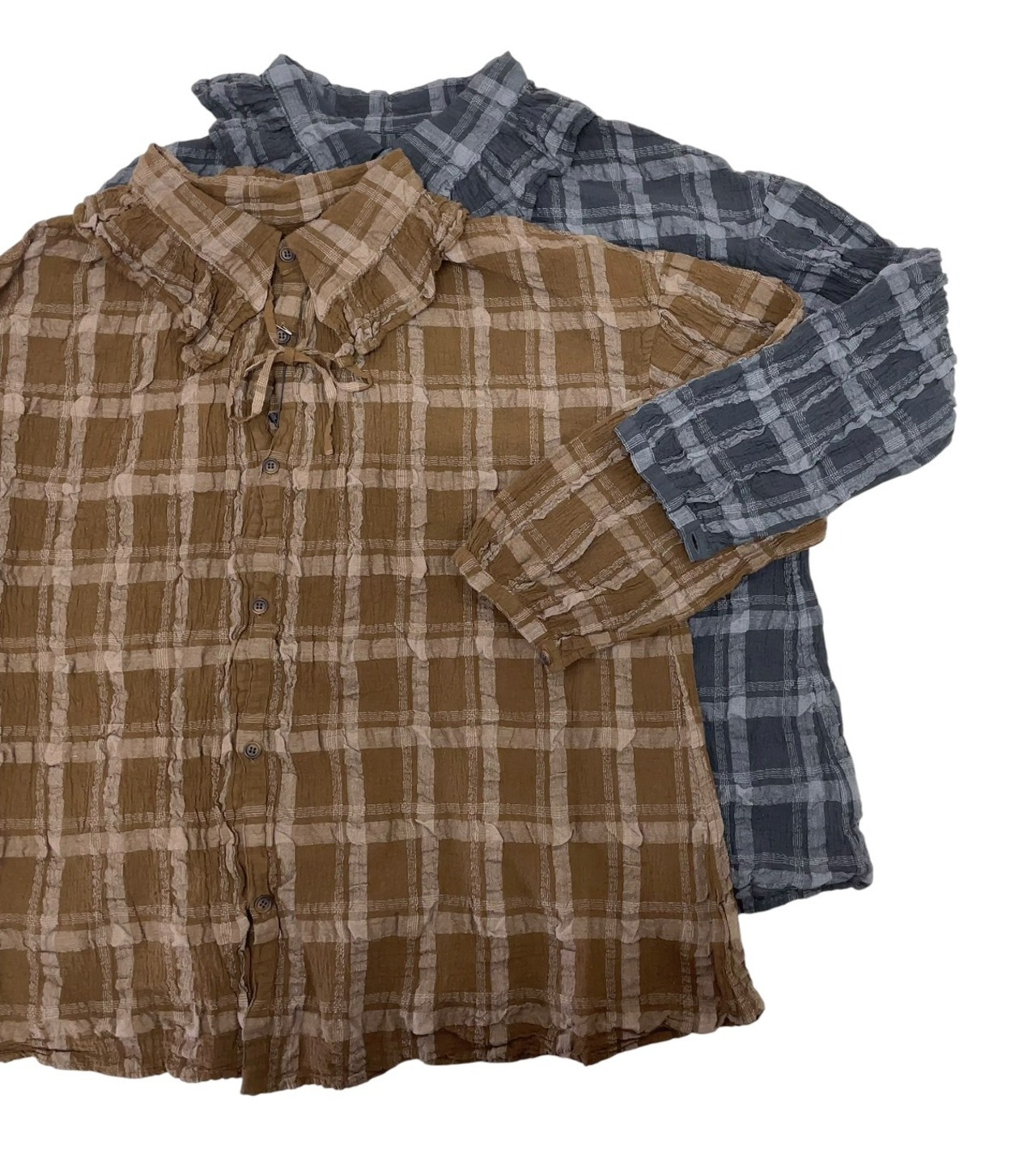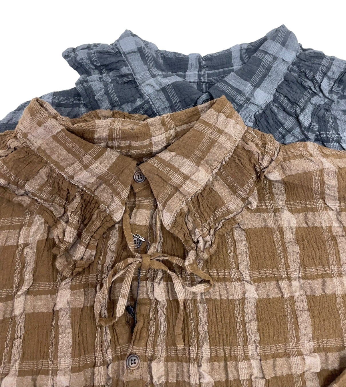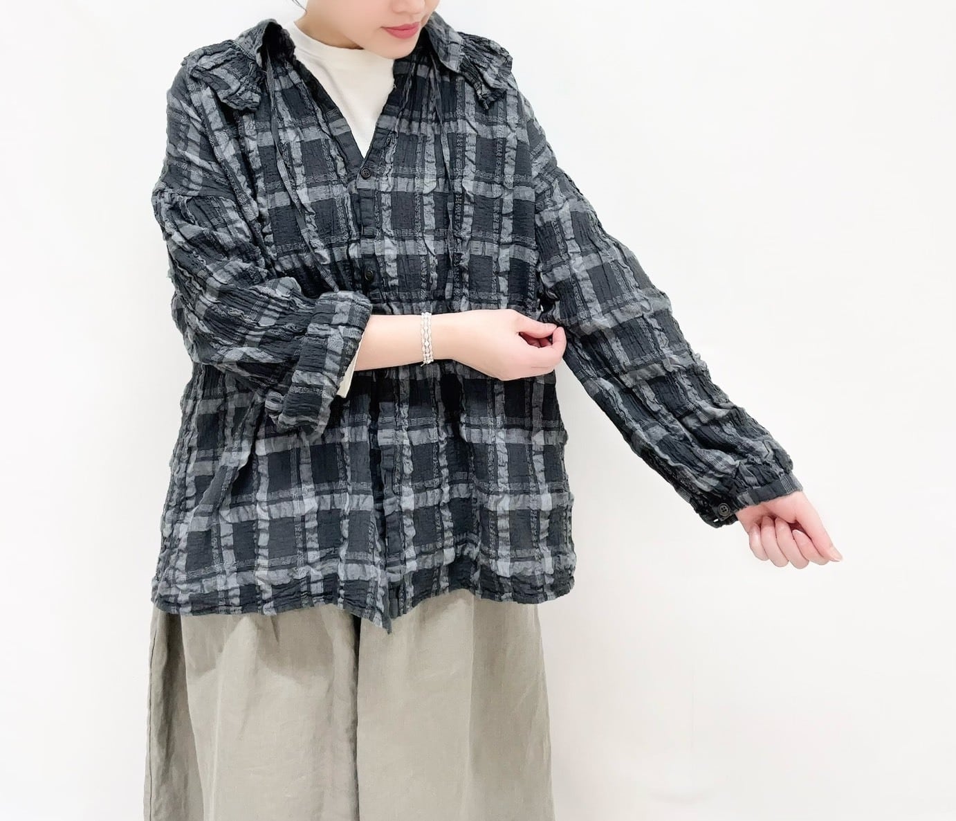 ユニークな素材感と、衿端にフリルを寄せた