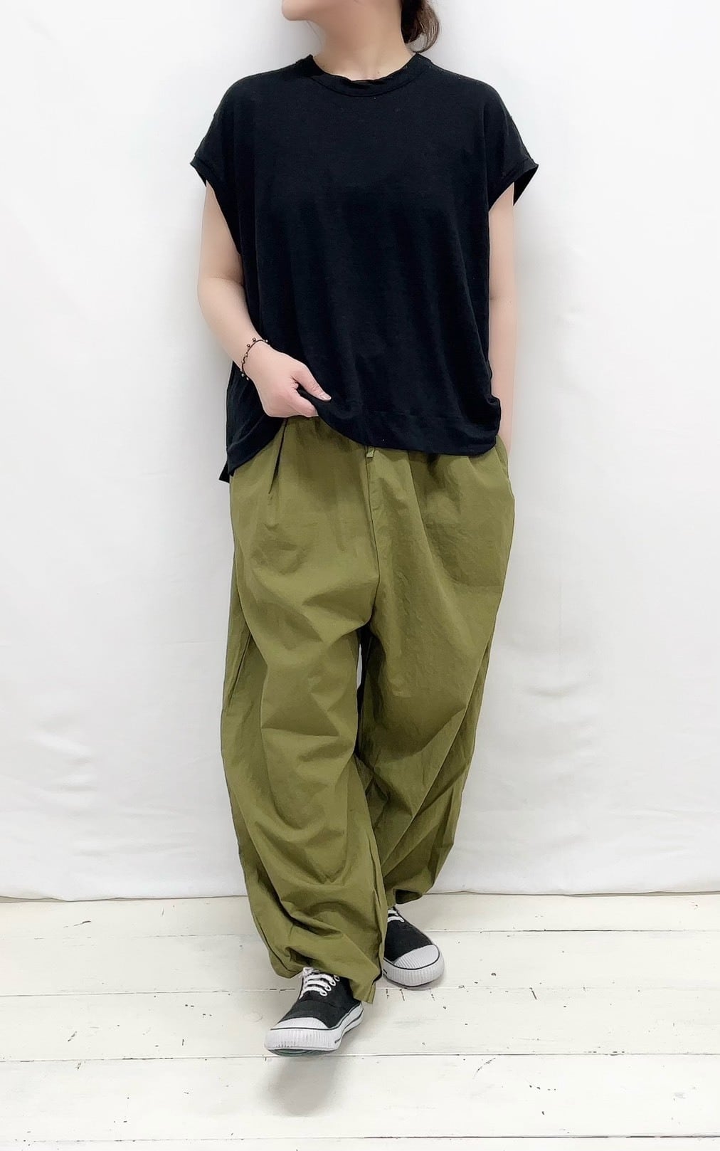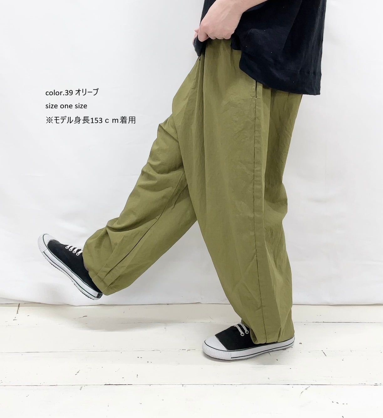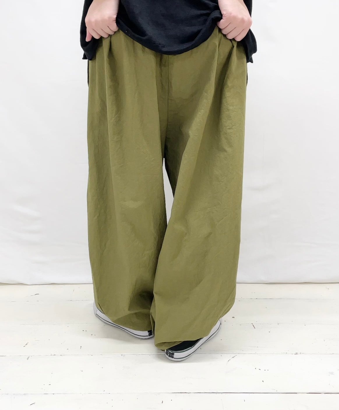 さらりとした綿素材が心地よく、肌に優しい着心地を実現しています。裾にはヒモが施され、自由にシルエットを調整することができるため、さまざまなスタイルを楽しめます。ゆったりとしたワイドシルエットは特にリラックス感があり、カジュアルなコーディネートにぴったりです。