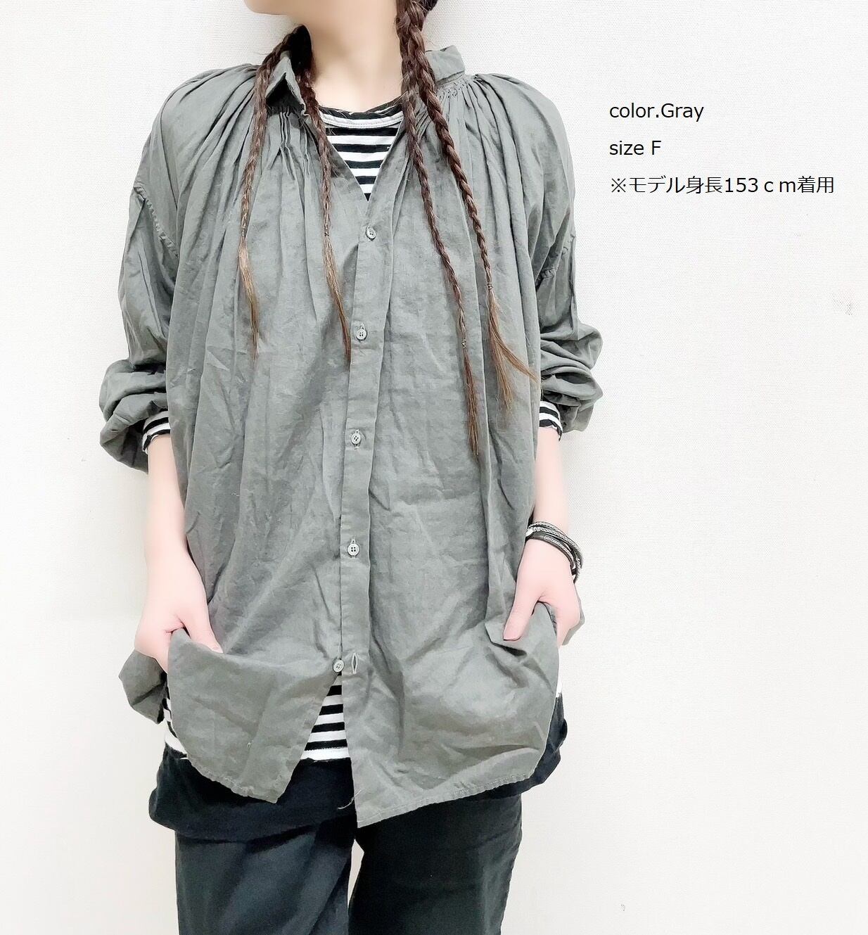 ブラウス。身幅が広く、肩のラインが落ちた